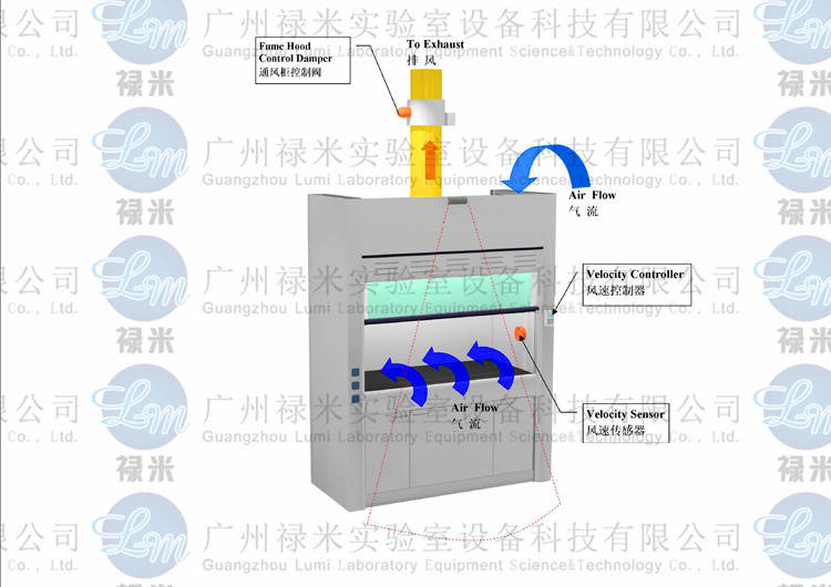 5、控制風速功能:為防止通風柜內有害氣體逸出,需要有一定的吸入速度。決定通風柜進風的吸入速度的要素有:實驗內容產生的熱量及與換氣次數的關系。其中主要的是實驗內容和有害物的性質。通常規定,一般無毒的污染物為0.25~0.38m/s,有毒或有危險的有害物為0.4~0.5m/s,劇毒或有少量放射性為0.5~0.6m/s,氣狀物為0.5m/s粒狀物為1m/s。為了確保這樣的風速,排風機應有必要的靜壓,即空氣通過通風管道時的摩擦阻力。確定風速時還必須注意噪音問題,通過空氣在管道內流動時以7~10m為限,超過10m將產生噪音,通常實驗室的室內背景噪聲級噪聲限制值為70dBA,增加管道截面積會降低風速也就降低噪音考慮到管道的經費和施工問題,必須慎重選擇管道及排風機的功率。