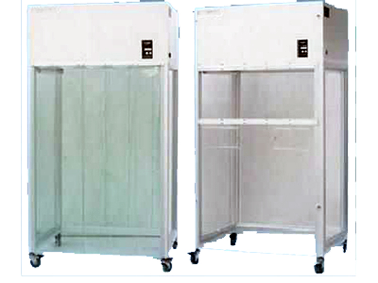 潔凈取樣車,采用垂直層流的氣流形式。變速離心風機將負壓箱內經過預過濾器過濾后的空氣壓入靜壓箱,再經高效過濾器進行二次過濾。從高效過濾器出風面吹出的潔凈氣流,以一定的均勻的斷面風速通過工作區時,將塵埃顆粒和生物顆粒帶走,從而形成無塵無菌的工作環境。